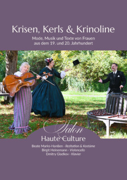 Die Kunsthistorikerin Dr. Beate Marks-Hanßen präsentiert in nach historischen Vorlagen selbst geschneiderten Kostümen Texte von Rahel Varnhagen, Jane Austen, Mary Shelley u.A., Birgit Heinemann (Violoncello) und Dmirty Gladkov (Klavier) spielen Musik von Komponistinnen des 19.und 20 Jahrhunderts (Maria Theresia von Paradis, Luise Adolpha Le Beau, Mel Boni, Amy Beach, Cécile Chaminade u.A..)