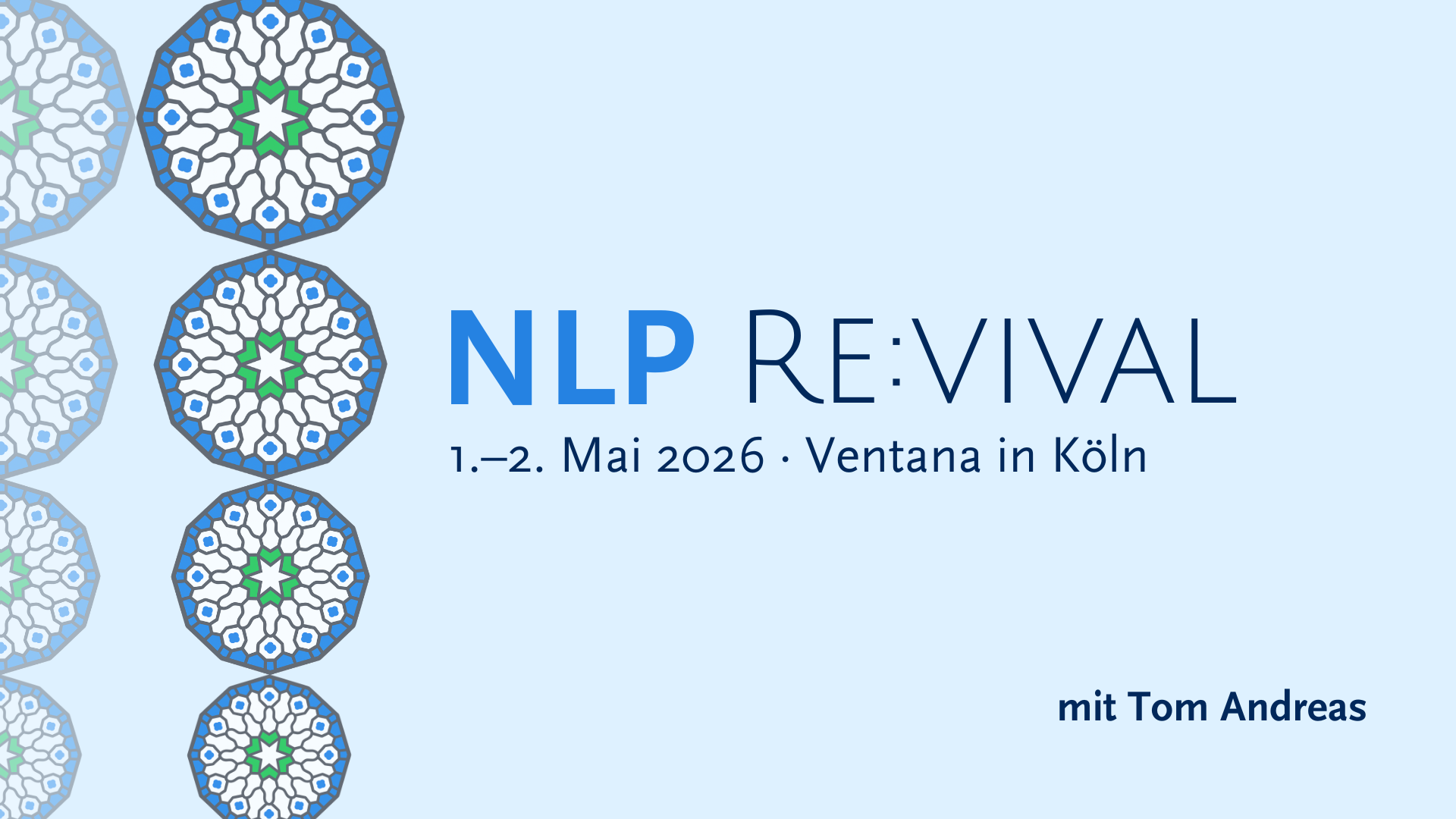 Eintauchen in das eigene Erleben von Identität, Beziehung und Wandel. NLP als Denk- und Handlungskultur (wieder-)entdecken und Selbstwirksamkeit erfahren. Das Institut Tom Andreas bietet seit über 25 Jahren NLP-Ausbildungen in Köln an und veranstaltet vom 1. bis 2. Mai ein NLP-Revival für ehemalige Teilnehmende. Gäste sind herzlich willkommen – Tom Andreas bittet um eine kurze Kontaktaufnahme vorab.