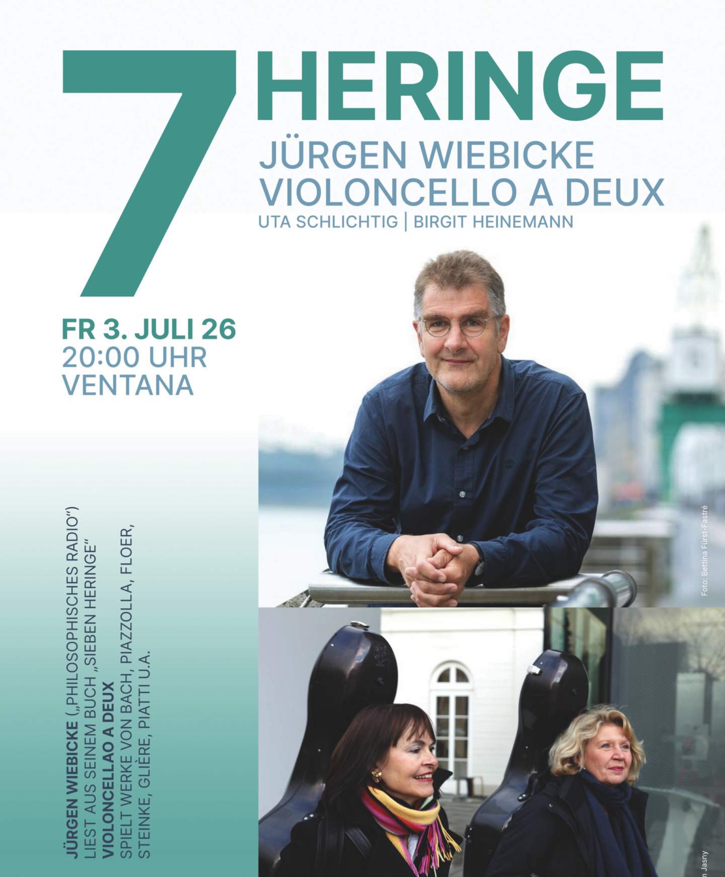 Das Celloduo „Violoncello à deux“ verdichtet und vertieft die gelesenen Episoden mit behutsam ausgesuchten Musikstücken von J.S. Bach, Astor Piazzolla, David Floer, Harriet Steinke, Reinhold Glière, Alfredo Piatti u.a. Sieben Heringe verspricht einen besonderen, einen poetischen Abend.